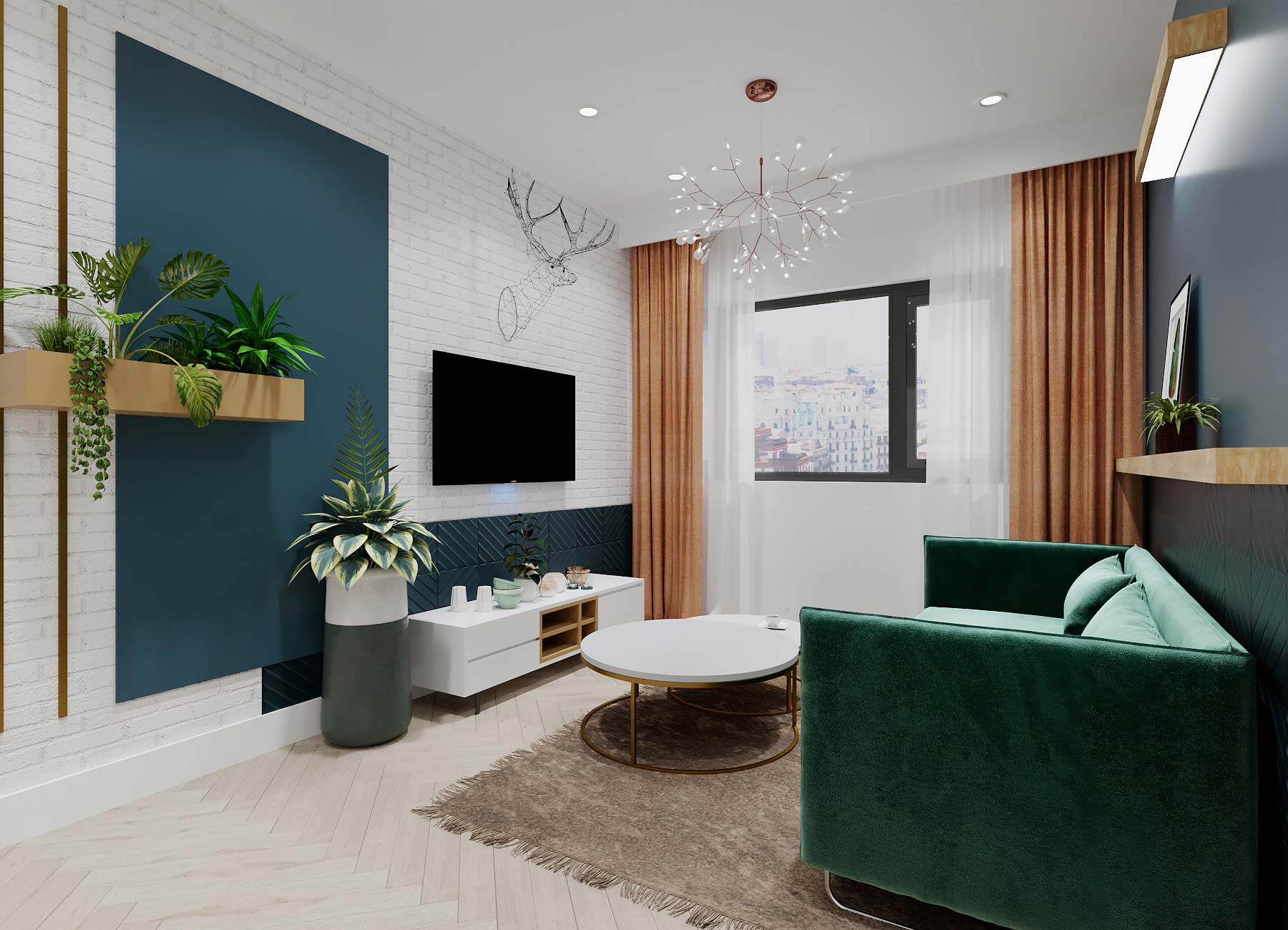 Các màu sắc sẽ được kết hợp hài hòa giữa tường, trần, sàn và đồ vật để không gây nên sự ức chế cho gia chủ. Vận dụng tỷ lệ hình học, các mảng tường sẽ được sơn dàn trải theo chiều ngang căn hộ để đánh lừa thị giác, tạo cảm giác không gian lớn hơn và thoáng đãng hơn. Phòng ngủ sẽ được sơn gam màu trung tính nhưng vẫn có điểm nhấn trong các đồ vật rời như ghế, đôn, bàn làm việc và bàn trang điểm. Bếp sẽ được thiết kế gọn gàng và tiết chế chi tiết, sử dụng linh hoạt các màu sắc tươi sáng như xanh coban, ghi xám và đen để tạo sự ấn tượng.